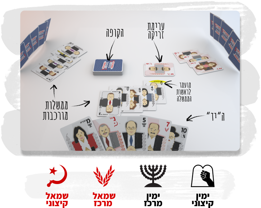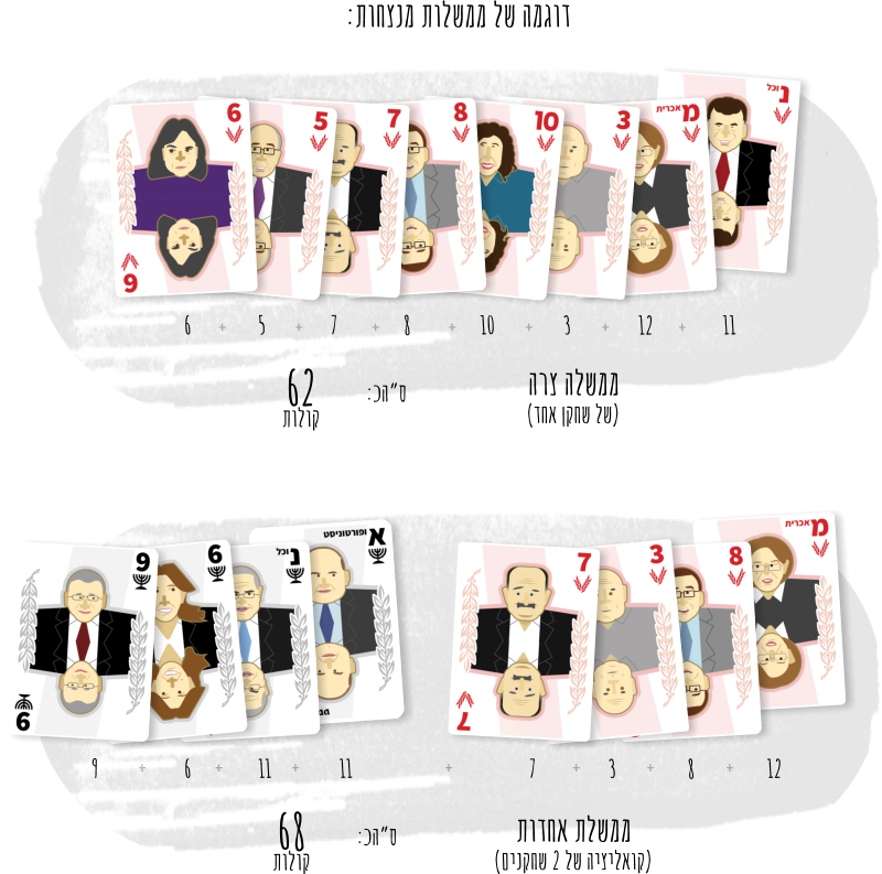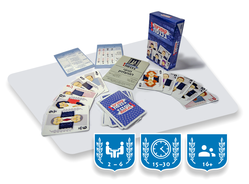משחק קלפים חברתי ומהיר עבור 2-6 שחקנים; קומבינה בכנסת מאפשר לשחקנים להתחרות כמועמדים לראשות הממשלה שמנסים להרכיב ממשלה. השחקן הראשון שמרכיב ממשלה שמקבלת לפחות 61 קולות , בעצמו או בקואליציה עם שחקן אחר, מנצח.